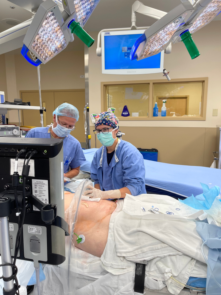 Pictured is RFU Senior Nurse anesthesiology Resident Jean Weigand, RN performing a TAP block on a surgical patient while training at St. Anthony Hospital in Denver, Colorado.